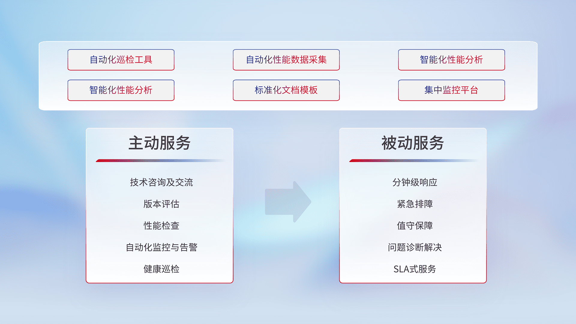 智能化工具和标准化文档,,,保障服务质量,,提供主动服务(包含技术咨询、、、版本评估、、、、性能检查、、自动化监控与告警、、、、健康巡检)和被动服务包含(分钟级响应、、紧急排障、、值守保障、、、、问题诊断解决、、SLA服务)。。。